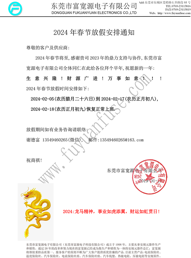尊敬的客戶及供應(yīng)商: 2024年春節(jié)將至,感謝貴司2023年的鼎力支持與協(xié)作,東莞市富寬源電子有限公司全體同仁在此給各位拜個早年,祝愿新的一年: 生意興隆!財源廣進(jìn)!萬事如意??!! 2024年春節(jié)放假時間安排如下: 2024-02-05(農(nóng)歷臘月二十六日)到2024-02-17(農(nóng)歷正月初八), 2024-02-18(農(nóng)歷正月初九)恢復(fù)正常上班.