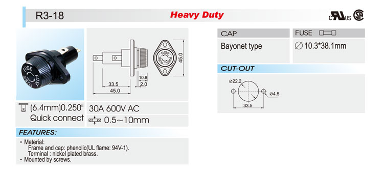 10*38面板安裝保險(xiǎn)絲座 R3-18 UL CSA 30A600V