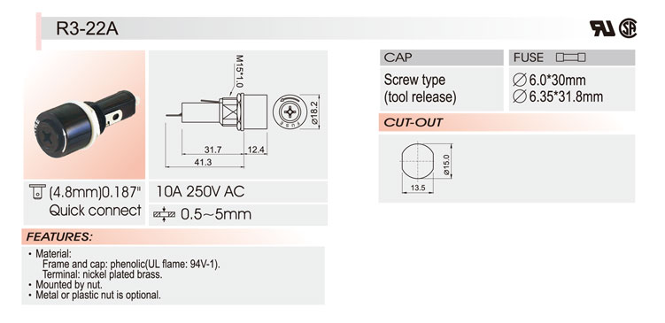 6*30面板安裝保險(xiǎn)絲座 R3-22A UL CSA 10A250V