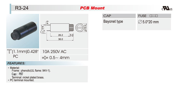 5*20 PCB安裝保險絲座 R3-24 UL CSA 10A250V