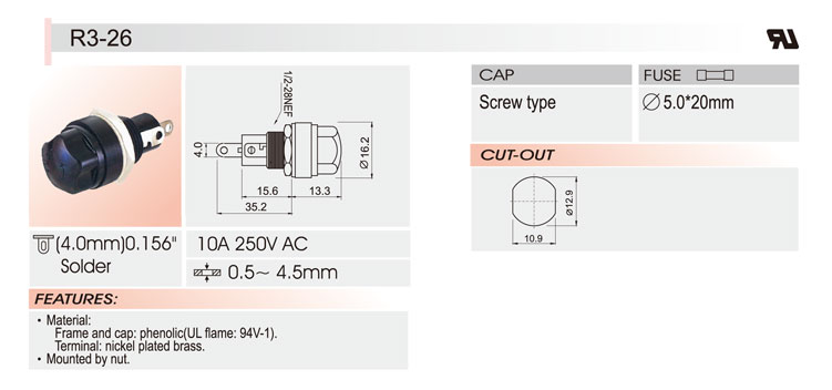 5*20 面板安裝保險絲座 R3-26 UL CSA 10A250V