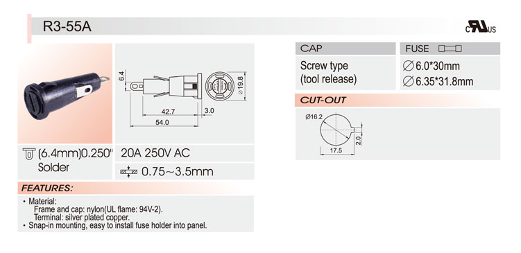 6*30面板安裝保險(xiǎn)絲座 R3-55A UL CSA 20A250V