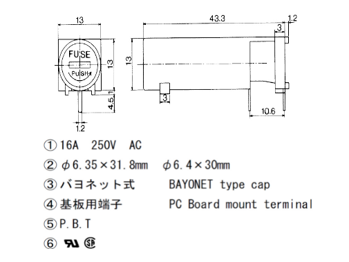 6*30 PCB板安裝保險(xiǎn)絲座 MF-560A UL CSA 16A250V