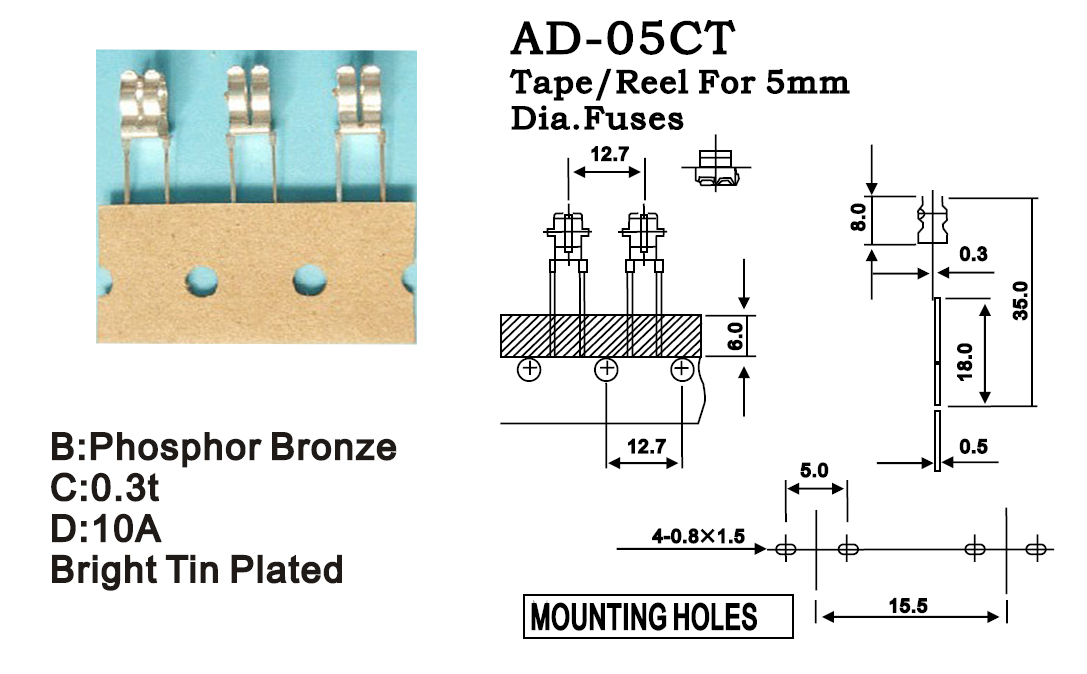 5*20 PCB板安裝 編帶保險(xiǎn)絲夾 AD-05CT ROHS
