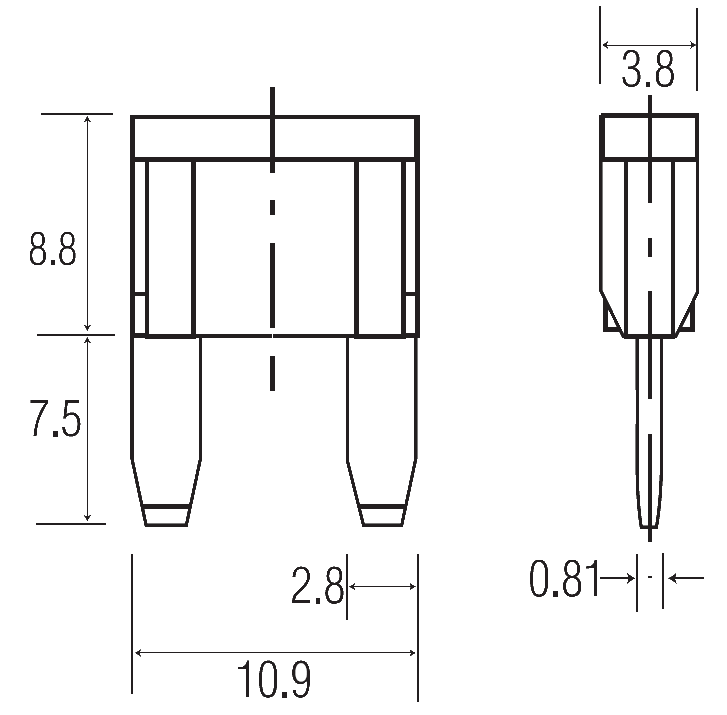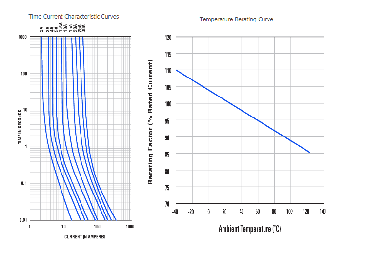 Interrupting Rating: 1000A @ 58 VDC Voltage Rating: 58 VDC Operating Temperature Range: -40?C to +125?C Terminals: Ag plated zinc alloy Housing Materials: PA66 Complies with: Meets SAE J2077 ISO 8820 UL 248 Special Purpose Fuses Time-Current Characteristics