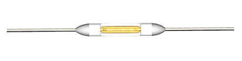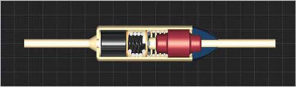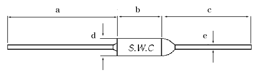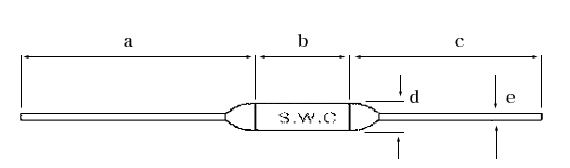 -SW-2 系列溫度保險絲由軸對稱的引線(leed )、在規(guī)定溫度下可熔化的金屬化合物可熔體(thermal element)及為防止其熔化氧化的特殊混合物(special compound)和絕緣容器(ceramic insulator)構(gòu)成。周圍溫度上升時特定的樹脂混合物開始液化, 當達到熔點時樹脂混合物熔化產(chǎn)生表面張力作用,之后連接兩個引線的金屬化合物熔化移向引線,從而永久切斷回路。