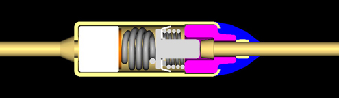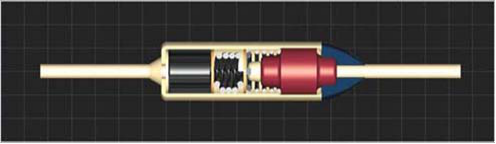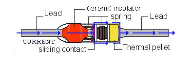-SW-1.3.5 系列溫度保險絲由可動觸點(sliding contact)、 彈簧(spring)、可熔體(electrically nonconductive thermal pellet)構(gòu)成。在溫度保險絲啟動之前電流從左側(cè)引線流向可動觸點(sliding contact),通過金屬外殼向右側(cè)引線流動。在外部溫度達到預(yù)定溫度時可熔體熔化,壓縮彈簧會變松。即彈簧膨脹,可動觸點(slidingcontact)與左側(cè)引線分離?;芈繁淮蜷_,可動觸點(sliding contact)與左側(cè)引線間電流被切斷。
